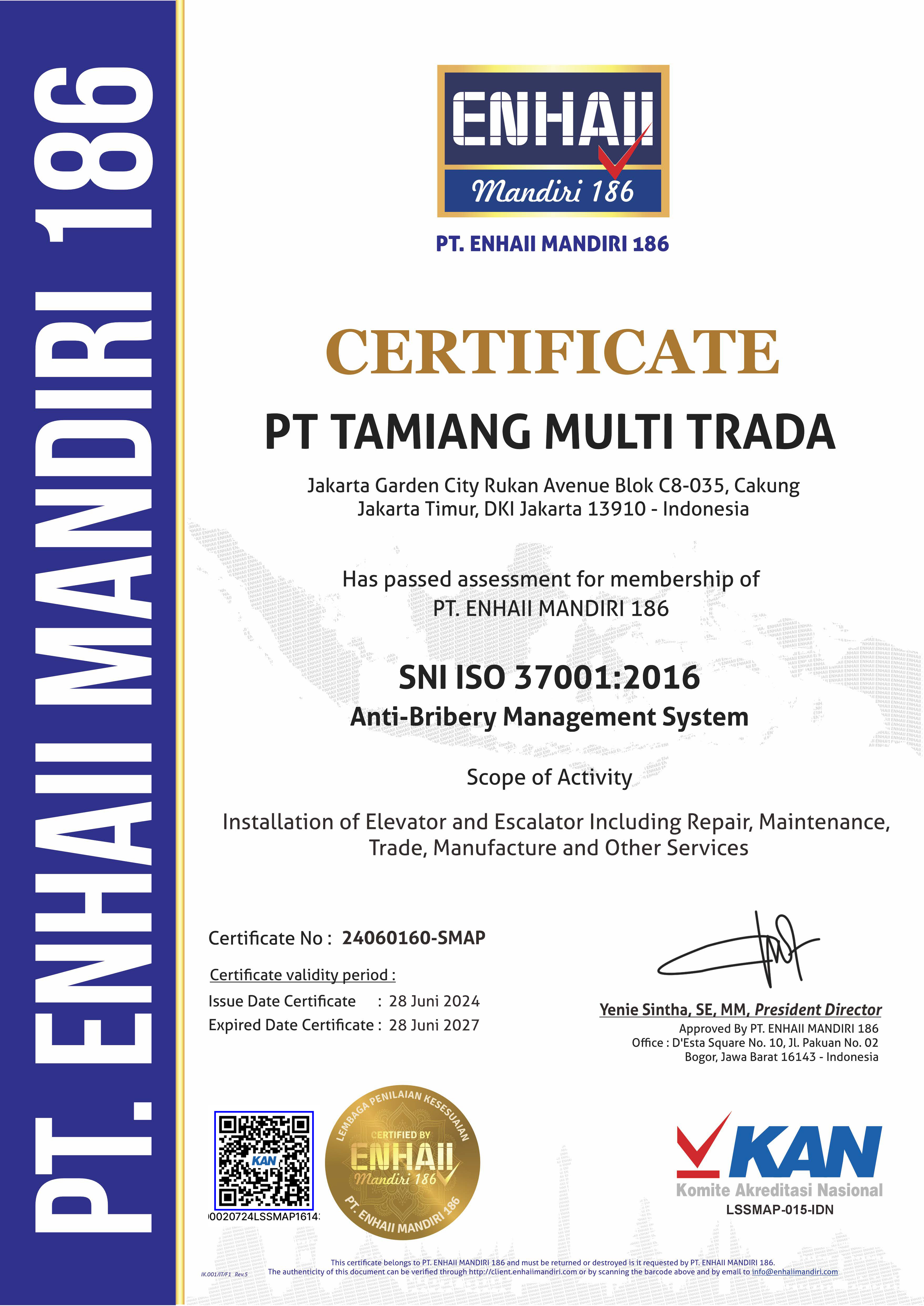 It is an honor and pride for us as well as the children of the nation since 2004 who gave their time, energy, thoughts, and hard work to produce a superior product quality elevator-escalator with the brand TAMIANG.To support economic growth and acceleration, improve public services and Acceleracy growth of new towns (new city development) in Indonesia, in the form of a business center, offices, hotels, airports, industrial and residential level (apartment).